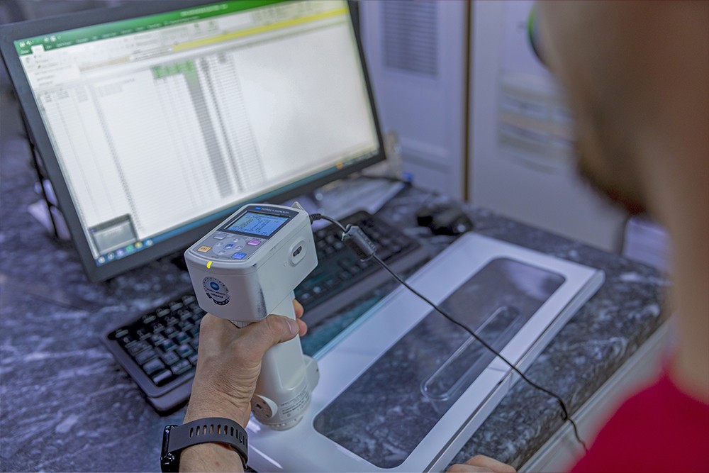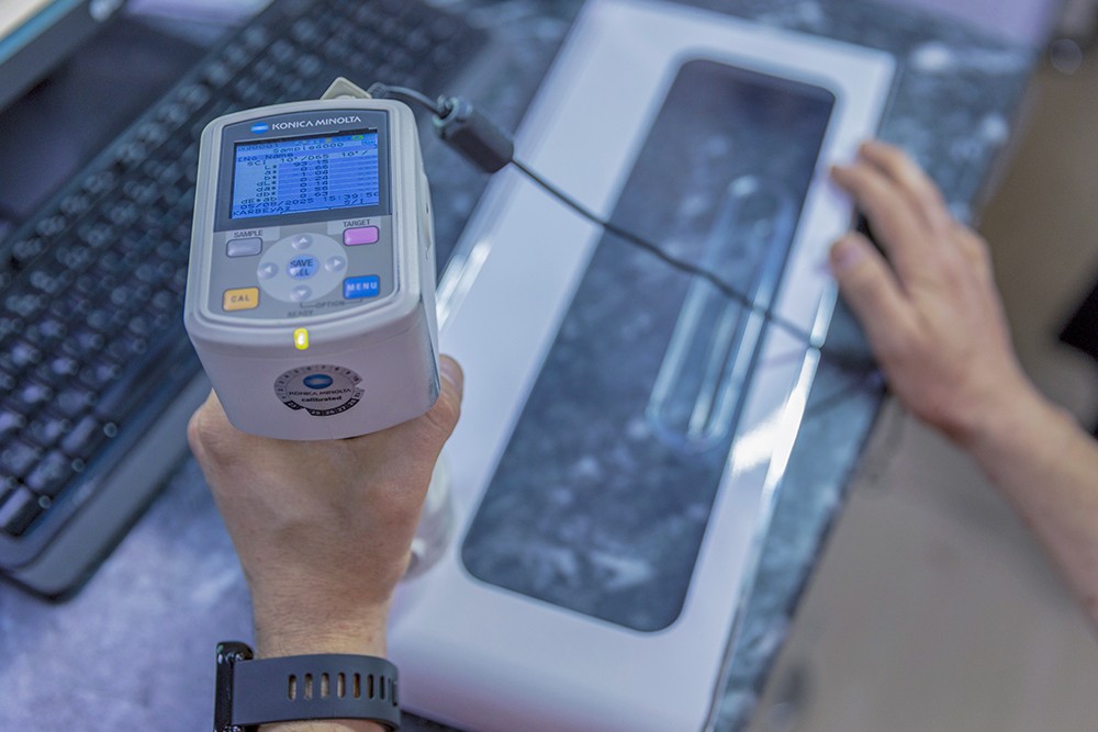 Üretim süreçlerimizde, ürettiğimiz ürünlerin renkleri, Pantone renk sistemi ve renk ölçüm cihazlarıyla titizlikle kontrol edilir. Bu işlem, ilk numune aşamasında başlar ve sonrasında her gün üretimden örneklem seçilen ürünlerle devam eder. Bu sayede, her ürünün doğru renk tonlarında üretildiğinden emin oluruz.